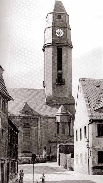 Neubau der Kirche „ein Bauwerk ohne jeglichen architektonischen Wert“, die kleiner war als die alte. Aus dieser Zeit ist in der Kirche noch der Taufstein erhalten. Auch der Epitaph des Bürgermeisters Sorgenfrei (in Seitenraum an der Wand) und der Rest des Westportals (Im Treppenaufgang) sind aus dieser Zeit erhalten.