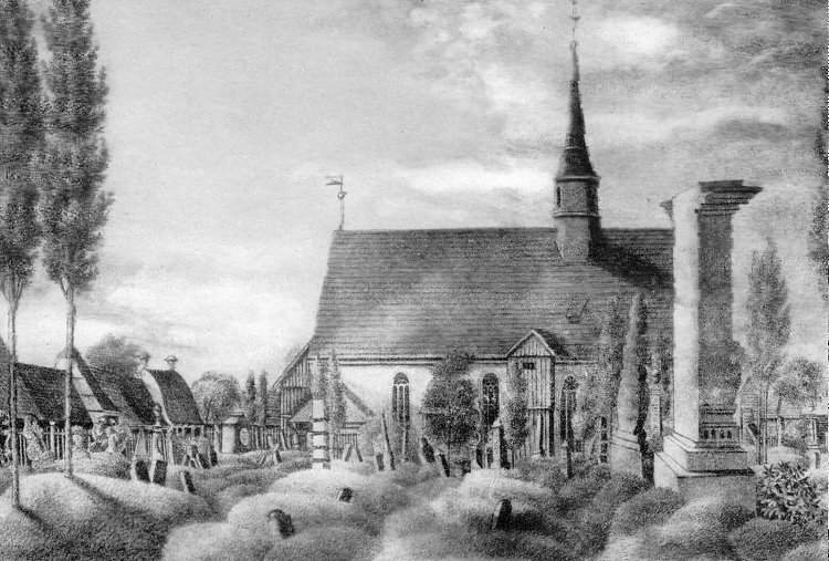 durch eine großzügige Spende wird die Erneuerung der Kirche möglich. Sie wird bis auf die Umfassungsmauern abgebrochen, um 0,70 m erhöht und neu aufgebaut; zunächst ohne Turm. Auch die Innenraumgestaltung wird vollständig verändert. Eine Kassettendecke wird eingezogen, neue Emporen errichtet, zwei neue Öfen zur Beheizung angeschafft und Gasbeleuchtung eingebaut. Des weiteren wurden die Fenster auf der Nordseite vergrößert.