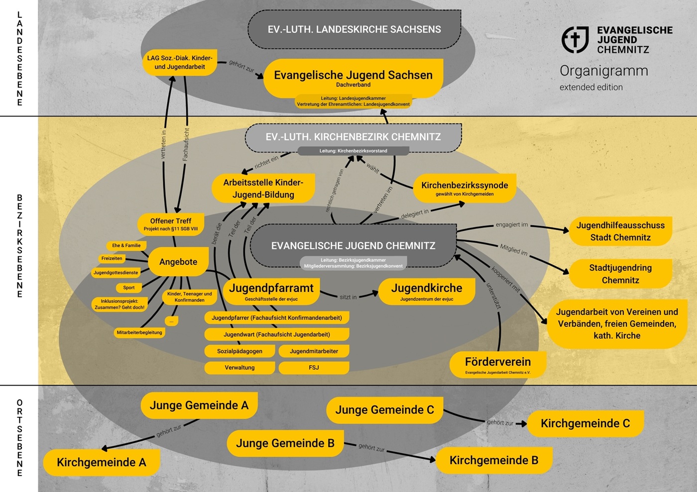 Die Evangelische Jugend Chemnitz (evjuc) ist ein Jugendverband im Ev.-Luth. Kirchenbezirk Chemnitz. Zu uns gehören etwa 30 Junge Gemeinden in Chemnitz und Umgebung. Das Jugendpfarramt ist die Geschäftsstelle der evjuc. Es befindet sich in der Jugendkirche - im Zentrum der Stadt.